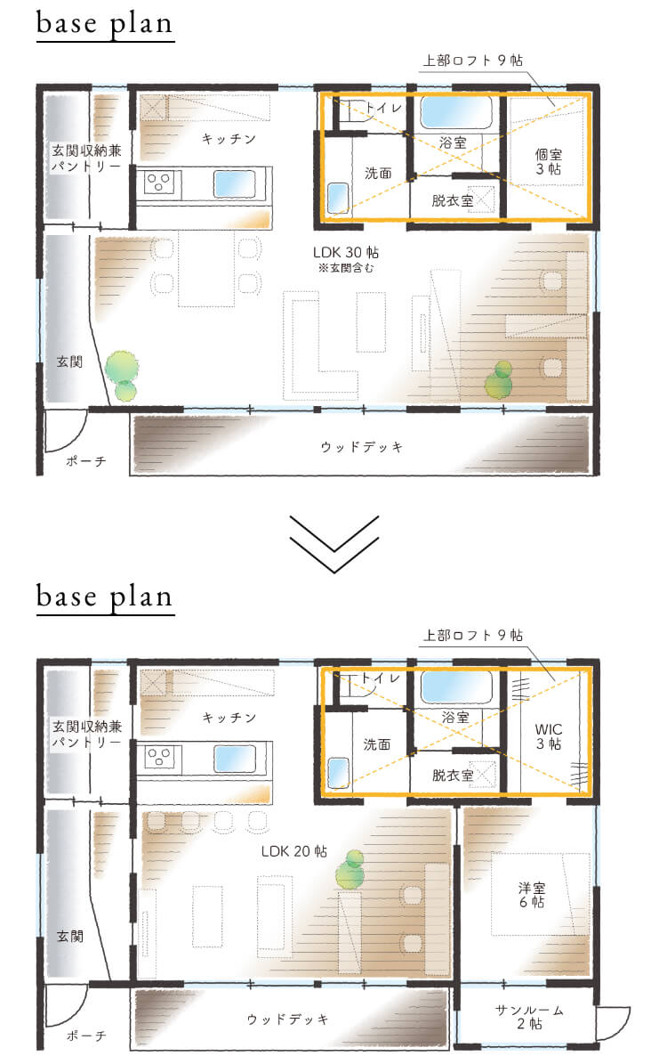 基本プランは間仕切りのない大きなワンルームのような住宅にすることで、ローコストかつ拡張性を備えています。余計な間仕切りや建具がない分、高性能ながらもローコストな住まいが実現可能です。もちろん、様々なプランへの変更も可能ですし、家族の成長に合わせて可変することも可能です。大空間はそのままに、家具で部屋を仕切っていく楽しみ方もあります。ロフトも標準でご用意していますのでロフト部分を子供部屋や書斎、倉庫などに使うことも可能です。